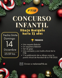 El dibujo ganador recibirá un kit exclusivo Babolat que incluye: Raqueta y raquetero, grips, camiseta y una toalla. Además, el dibujo será publicado como Postal de Navidad FTIB 2025.