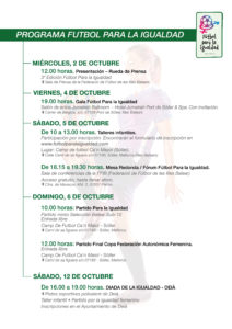 En la rueda de prensa de esta mañana se ha presentado todo el programa de actividades que definen el evento Fútbol Para la Igualdad. Evento que se celebrará del 4 al 6 de Octubre en Sóller y Palma. Tres días llenos de actos que empezarán con una gala presentación y Entrega de Premios Deporte Para la Igualdad, talleres infantiles, el Foro Fútbol Para la Igualdad (Ciclo de conferencias) y finalizarán, el domingo, con el Partido Para la Igualdad.