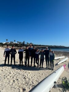 Diumenge es va continuar amb treball més tècnic a la badia de Ciutadella i pràctica de sortides ‘australianes’ a Cala’n Blanes, compartint experiències amb palistes amb trajectòria internacional.