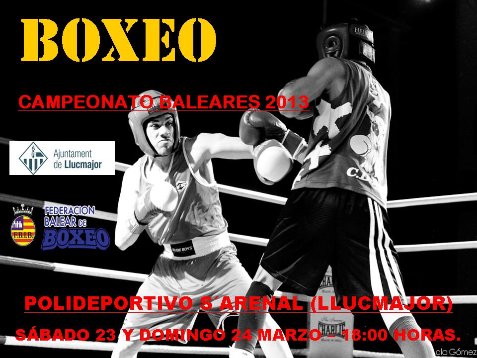 El Campeonato de Boxeo Balear cadete, junior, femenino y élite para el presente 2013 ya está en marcha. Las semifinales y finales del mismo se llevarán a cabo en sendas veladas los próximos días 23 y 24 de marzo, sábado y domingo, en el Polideportivo de S´Arenal (Llucmajor – salida número 13). Ambas veladas comenzarán a las 18:00 horas. El sábado tendrán lugar las semifinales y al día siguiente, domingo, las finales.
