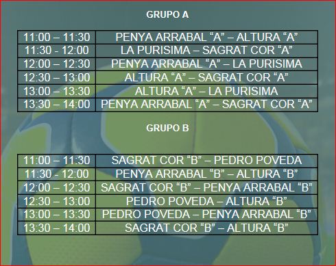 Els partits es dividiran en dues parts que duraran 10’ cadascuna, amb un descans de 5’. Els equips dispondran de 5’ per prepararse per al següent partit. D’aquesta manera, els torns dels partits seran de 30’.