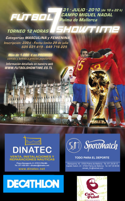 El próximo día 31 de Julio (Sábado) tendrá lugar el PRIMER TORNEO SHOWTIME organizado por los jugadores de la plantilla de 2ª Regional del Sporting Palma. La inscripción de un equipo son 220 € con la posibilidad de ganar 700€ si quedas campeón o 300€ si consigues llegar a la final. Apetecible torneo veraniego para sudar la camiseta y para luchar por un buen premio. Sin duda uno de los torneos a seguir durante este verano. Si deseais más información nuestros amigos del SHOWTIME han puesto una web a vuestra disposición: www.futbolshowtime.es.tl .