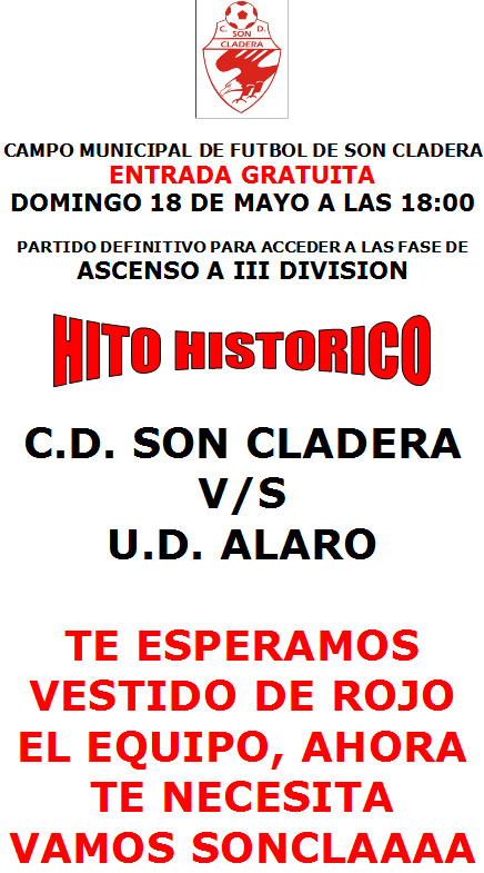 Este próximo domingo día 18, a las 18:00, en el Campo Municipal de Fútbol de ésta pequeña barriada de Palma de Son Cladera, se vivirá un hito histórico al jugar por primera vez, su humilde equipo de fútbol, partido de clasificación para optar a fase de ascenso a III DIVISION, en caso de salir airoso contra la U.D. Alaró, equipo ya clasificado para disputarla.